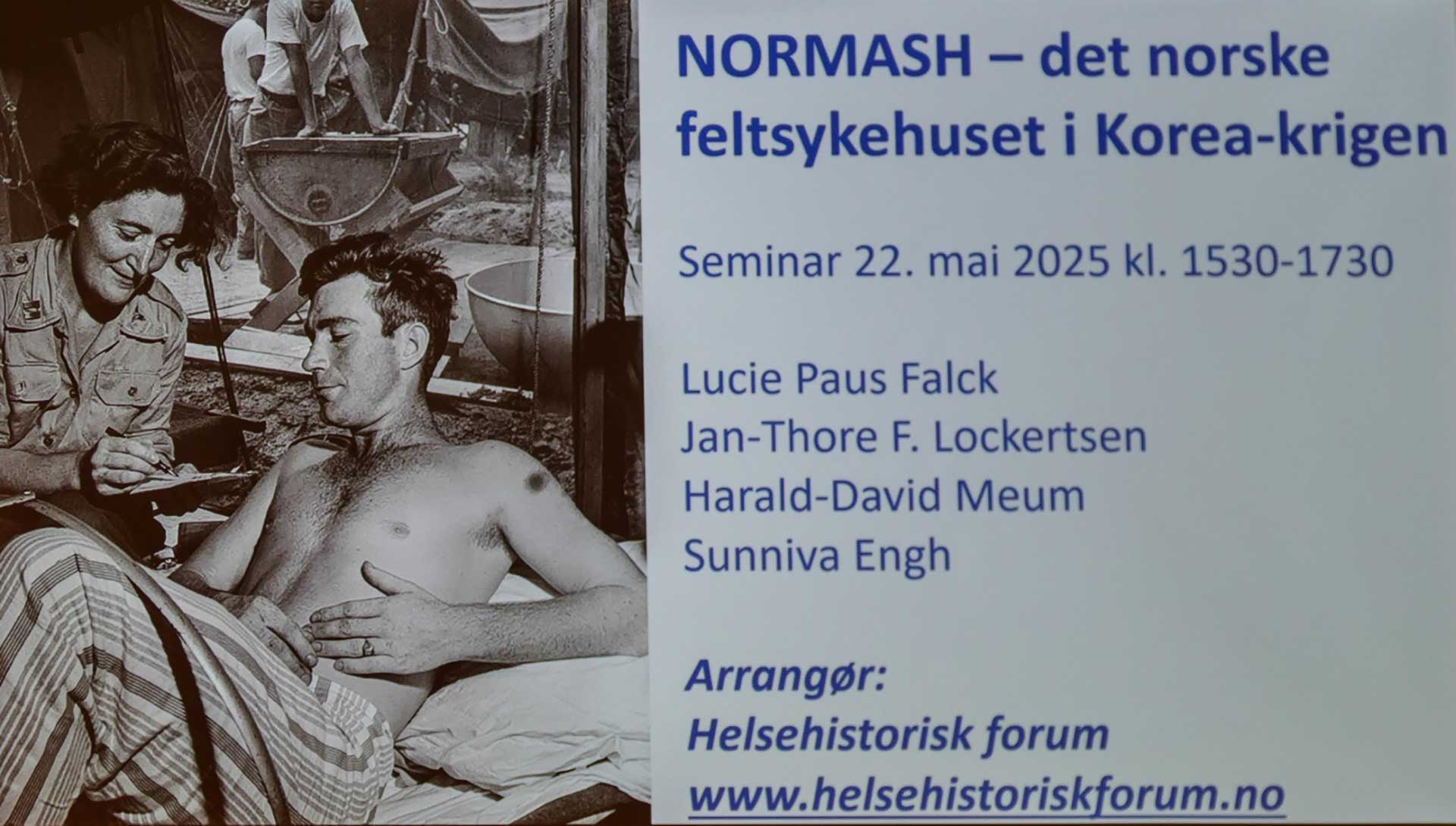 Noen av deltakerne etterlot seg også viktig bildemateriale, som er tilgjengelig på Digitalt museum, blant andre oversykepleier Emma Folven (1913–1987) og kirurgen Inger Schulstad (1920–2010). Helsehistorisk forum arrangerte seminar om Koreakrigen 22. mai 2025 (figur 1) for å gjøre noe med glemselen som har senket seg.