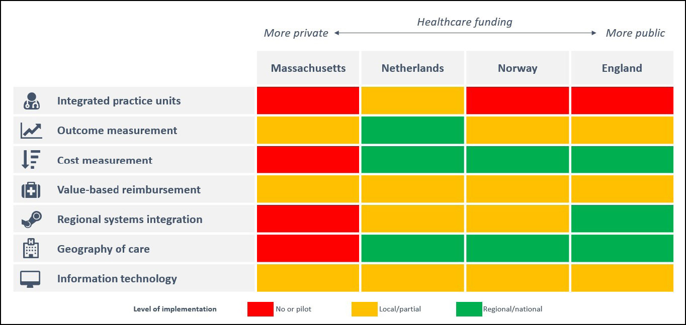 Figure 1. Implementation of the value-based healthcare elements in Massachusetts (USA), the Netherlands, Norway, and England (United Kingdom) as of August 2020 (1).