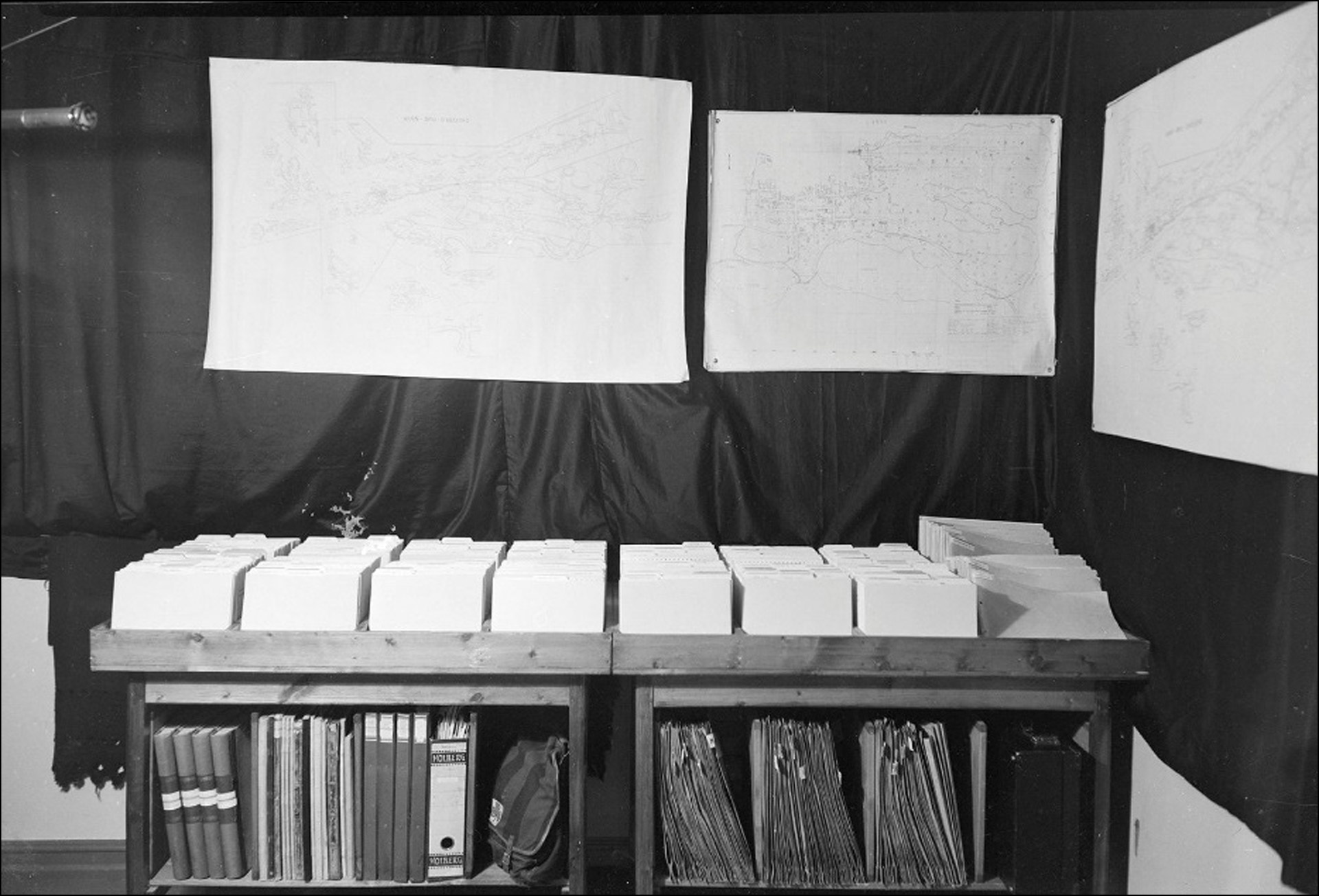 Figur 3. Bildet viser arrangementet av kart, kartotek, protollar o.l. frå Florø helsestasjon (distriktslegebustaden). Kartoteket omfatta til slutt over 7000 personar. Store kart dekka alle husstandane i ein skulekrins. Hendingar og testplan vart teikna inn på kartet, med nytt kart kvart år. På bordet står personmappene etter kjøn og fødselsdato, til høgre husstandsmapper. I hyllene under står protokollar, røntgenbilde og annan dokumentasjon.