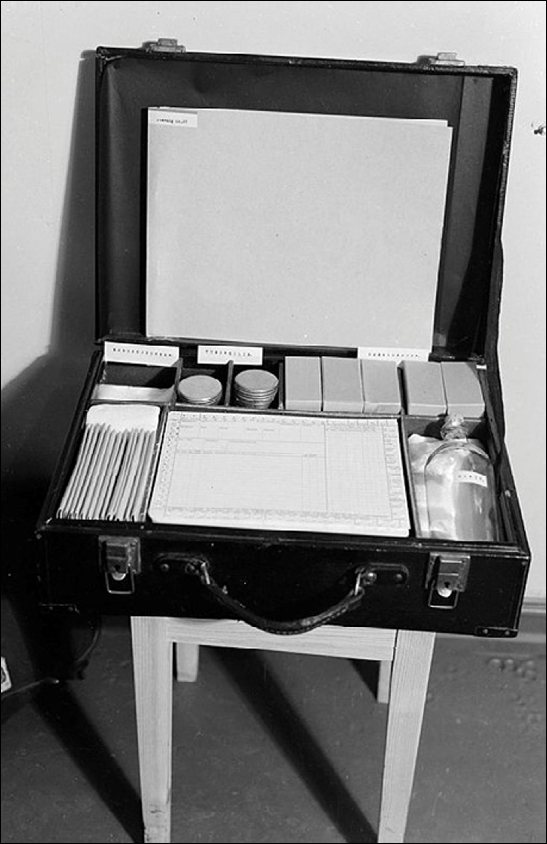 Figur 4. Bildet viser den spesiallaga helsesøsterkofferten. I ryggen står husstandsmappene. Bakerst i kofferten ligg frå venstre bandasjesaker, tuberkulin og pennesplittar for testing samt spyttprøveglas. Fremst er frå venstre bandasjesaker, kartotekkort og til slutt desinfeksjonssprit.