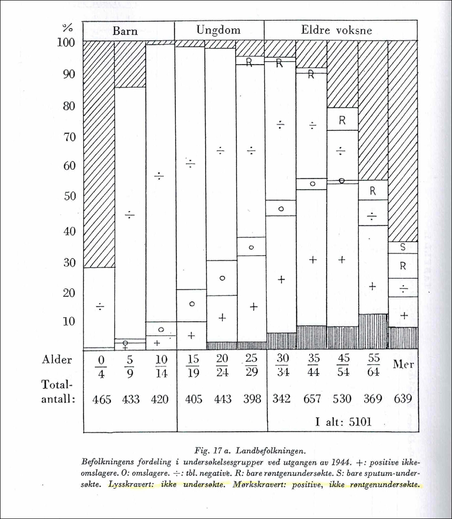 Figur 5. Resultata av tuberkulin-undersøkingane (Pirquet) frå landkommunane ved utgangen av 1944 (n= 5101) i prosent og etter aldersgrupper. Lysskravert (øverst): Ikkje undersøkt. Mørkskravert nedst til høgre: Tuberkulin-positive, ikkje røntgenundersøkt. Minusteikn: Tuberkulin-negative. O: Omslagarar. Plussteikn: Tuberkulin-positive. S: Berre spyttprøve. R: Berre røntgen.