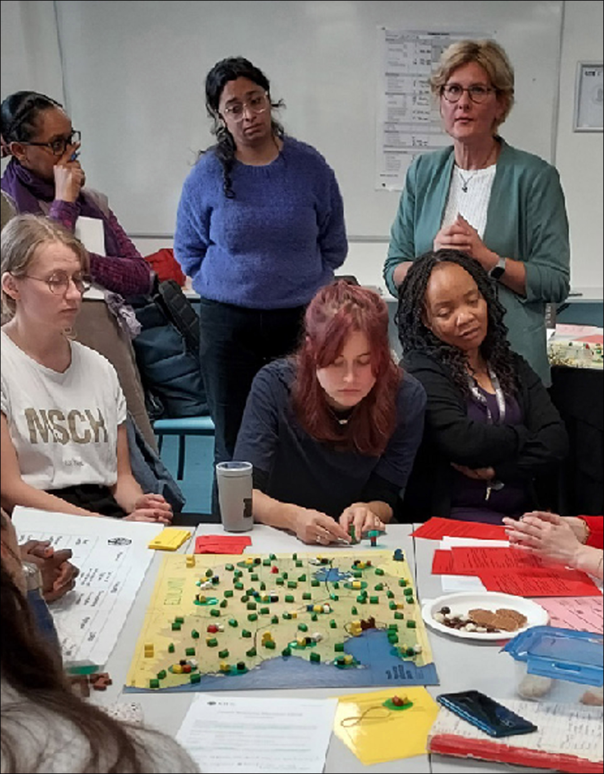 Ein spesielt nemneverdig del av Folmer sin internasjonale innsats for utdanning innan primærhelsetenester, er utviklinga av Health Resource Allocation Game, eit brettspel som øver studentar i fordeling av helseressursar innan gitte rammer (Folmer 1980, Folmer 1987). Folmer utvikla dette Monopol-liknande spelet på slutten av 1970-talet til bruk ved Royal Tropical Institute (KIT), til undervisningsoppdrag i utlandet og som eit kommersielt produkt (Health Resource Allocation Game 2024). Studentane skal planleggje eit optimalt helsesystem for å møte krav og behov, både kurative og førebyggjande, og til slutt vise korleis ei gruppe pasientar skal behandlast i modellen som er valt. Spelet tar ein eller to dagar å spele. Folmer laga sjølv det første spelet med eigne hender, inkludert å spikke ut alle trebrikkene som symboliserer ulike helseinstitusjonar og andre ressursar. Spelet blir brukt over heile verda med tusenvis av deltakarar, også ved Universitetet i Bergen (Senter for internasjonal helse 2020) (figur 4). Folmer seier sjølv at ikkje berre erfaringane frå Afrika, men også dei sterke inntrykka frå Tysfjord, har hatt avgjerande innverknad på hans syn på verdien av ei sterk primærhelseteneste, på kampen mot ulikskap i helse og prinsippa om rett behandlingsnivå. Spelet er no modernisert med sjukdomspanorama frå Global Burden of Disease-prosjektet (GBD 2016).