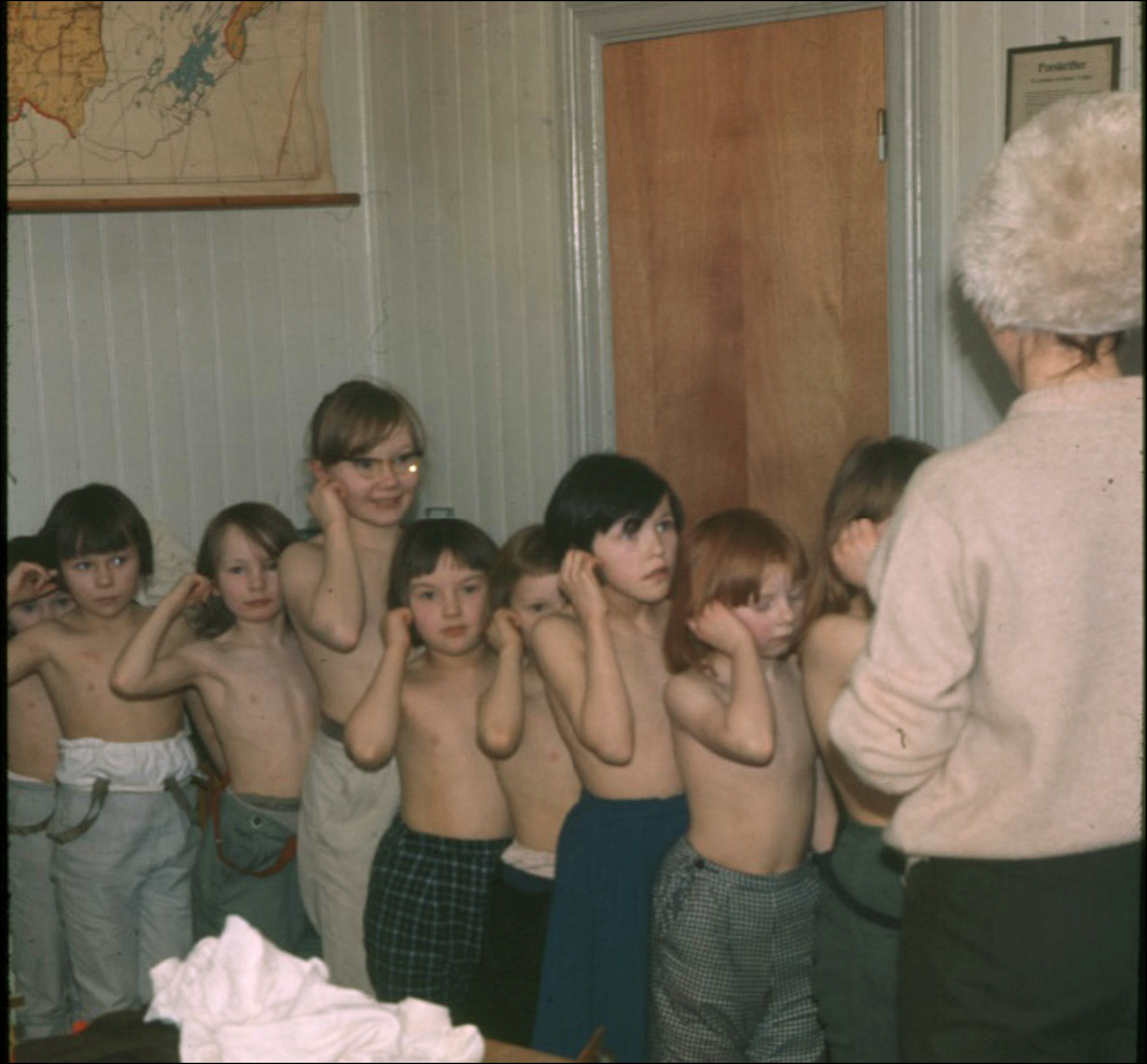 Figur 6. Hørselsundersøking av skuleborn i Kjøpsvik. Helsesesøster organiserer at elevane har ein finger i eine øyret, medan dr. Folmer testar hørselen i det andre øyret ved kviskreprøve frå elev til elev.