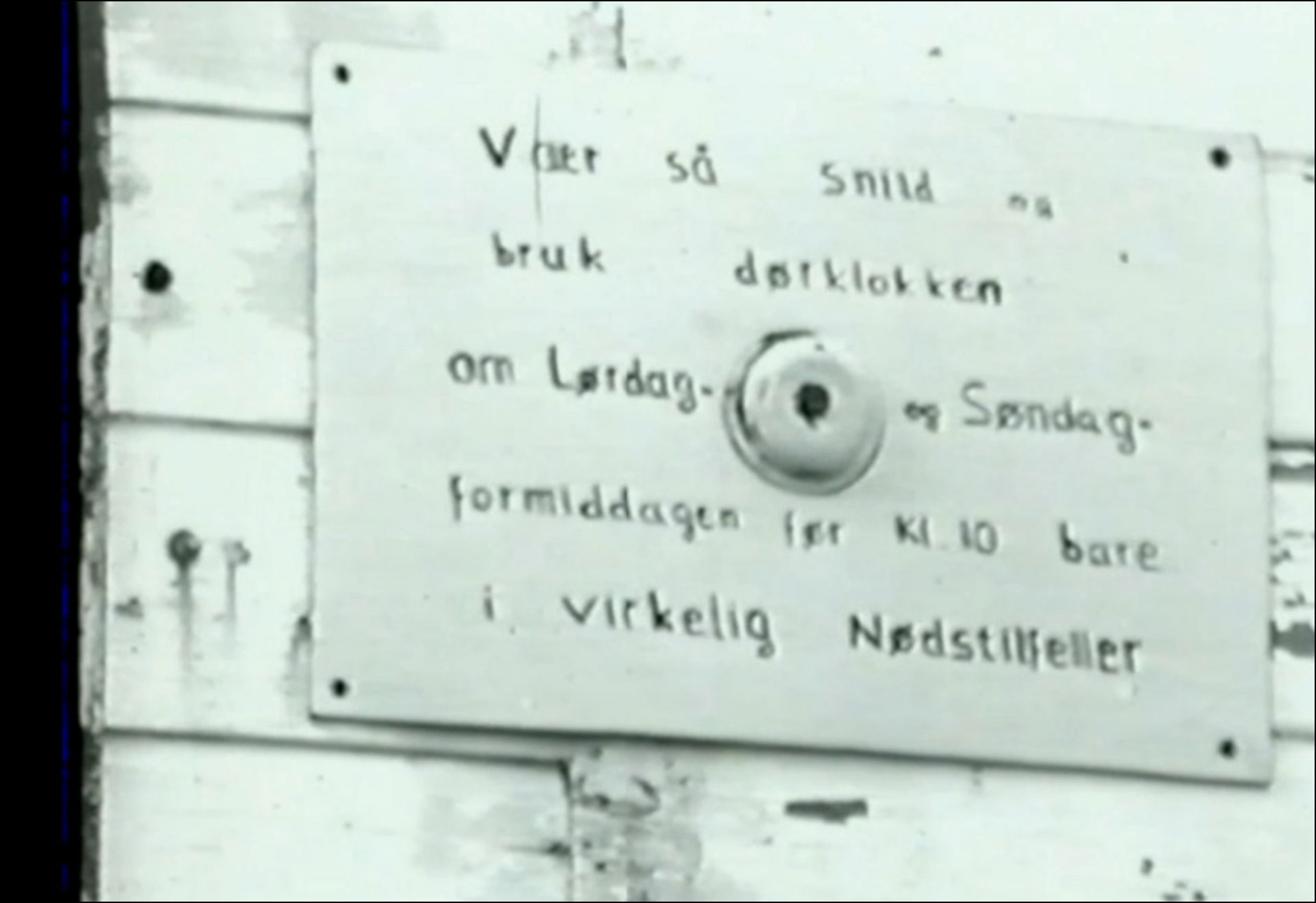 Figur 8. Skilt ved døra til doktorbustaden i Kjøpsvik. Teksten oppmodar om å forstyrre legen berre i naudsfall, i alle fall laurdag og søndag formiddag! Frå filmen Doktor aan de fjord (NCRV 1965).