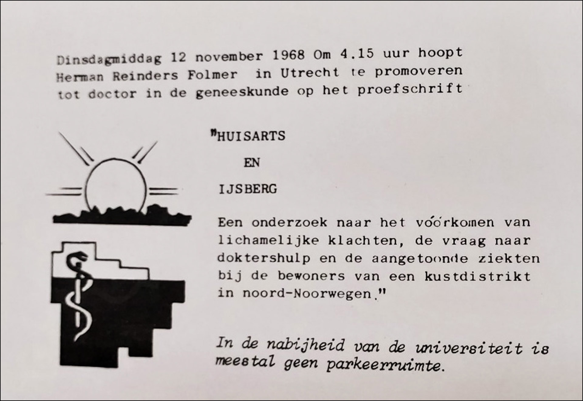 Folmer HR. Huisarts en ijsberg. Een onderzoek naar het voorkomen van lichamelijke klachten, de vraag naar doktershulp en de aangetoonde ziekten bij de bewoners van een kustdistrikt in noord-Noorwegen. Doktoravhandling (Doctor in de geneeskunde). Utrecht: Universitetet i Utrecht, 1968.