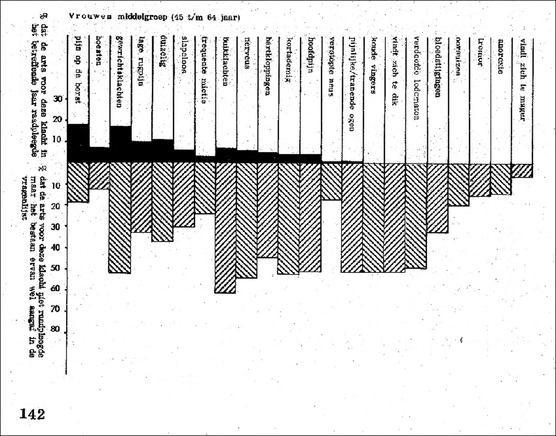 Figur 13. Det medisinske isfjellet. Eksempel på figur frå avhandlinga som viser samanhengen mellom 22 registrerte symptom i innbyggarundersøkinga og kva plager som vart presentert for legen (den usynlege og synlege delen av «isfjellet»). Eksempelet viser resultata for kvinner i aldersgruppa 45-64 år. Dei svarte søylene øvst viser prosentdelen som konsulterte legen for dette symptomet i det aktuelle året. Dei skraverte søylene nedst viser prosentdelen som ikkje konsulterte legen for dette symptomet, men som markerte det som opplevd i spørjeskjemaet. Vi ser at dei åtte symptoma lengst til høgre ikkje førte til legesøknad i det heile, medan symptomet lengst til venstre (pijn op de borst – brystsmerter) hadde stor del legesøknad, men likevel ikkje meir enn om lag halvparten.